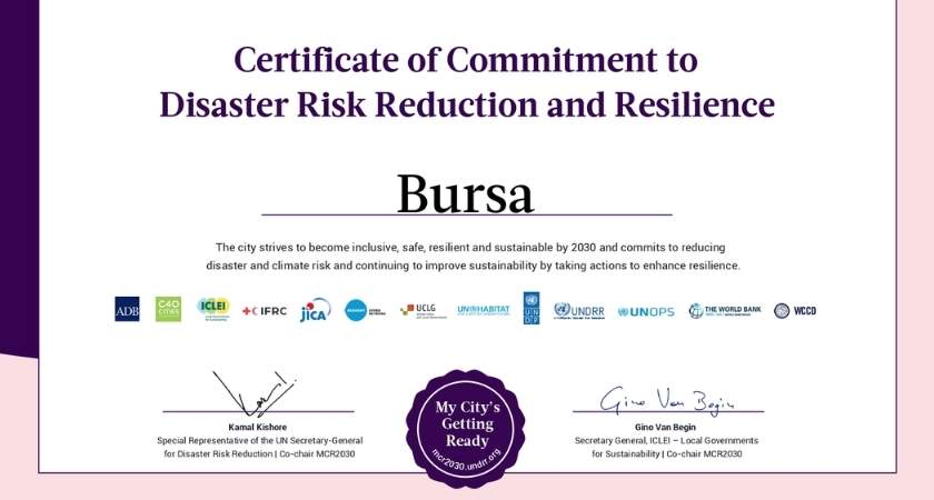 Bursa Büyükşehir Belediyesi, Birleşmiş Milletler (BM) bünyesindeki Afet Risk Azaltma Ofisi tarafından kentlerin afetlere karşı dirençli hâle getirilmesi, iş birliği yapılması ile karşılıklı bilgi ve tecrübelerin paylaşılması amacıyla başlatılan ‘Making Cities Resilience 2030’ (MCR2030) (Şehirleri Dirençli Hale Getirmek) programına üye oldu.