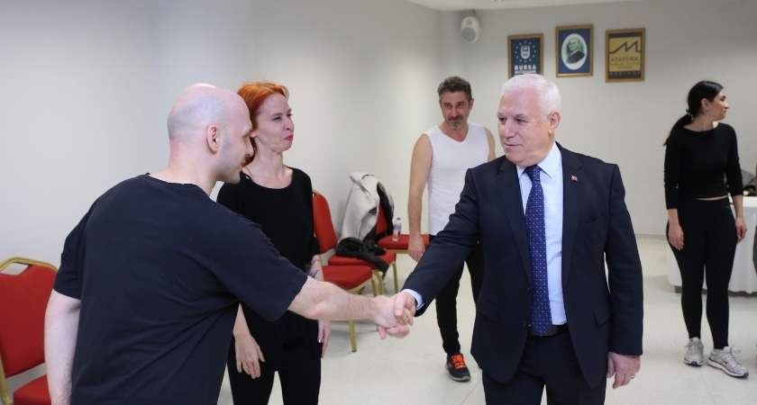 Bursa Büyükşehir Belediye Başkanı Mustafa Bozbey de yeni oyunun provası için çalışmalarını sürdüren Şehir Tiyatrosu oyuncularını ziyaret ederek sohbet etti. Genel Sanat Yönetmeni Ali Düşenkalkar’ın da bulunduğu ziyarette, Başkan Bozbey oyunculara başarılar diledi. Tiyatroyu 17 ilçeye taşımak için çalışmaları sürdürdüklerini ifade eden Başkan Bozbey, tüm Bursa’yı sanatla buluşturmayı hedeflediklerini söyledi.